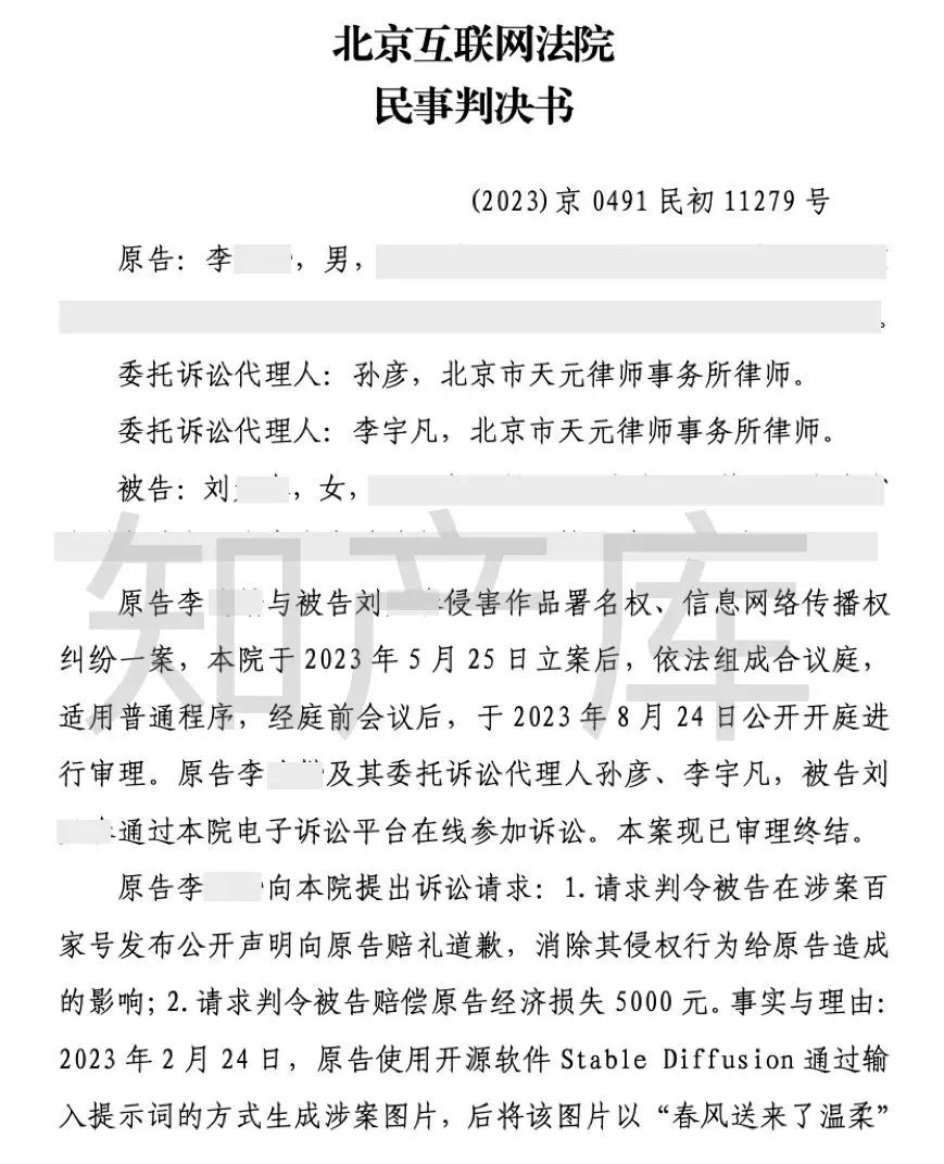 本案中,原告先于2月24日使用开源软件Stable Diffusion通过输入提示词的方式生成涉案图片后,将该图片以“春风送来了温柔”为名发布在小红书上。3月2日,被告在百家号账号“我是云开日出”发布名为《三月的爱情,在桃花里》的文章时,在配图中使用了未获得原告许可的涉案图片,且截去了原告在小红书平台的署名水印。